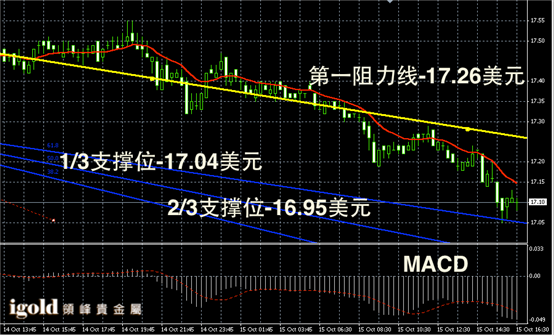白银阴阳烛录得柱体低于红色日均线,末端阳烛回升,暂时持稳在17.1美元附近,短线MACD显示空头还在增加,白银价格短线或下探至17美元附近,若跌破17美元,跌幅或有所扩大。