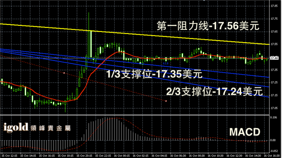 白银长线阴阳烛录得小幅高于红色日均线,且MACD显示空头消散,RSI录得45,暂时收平,交易量有所下降。白银阴阳烛录得或很难突破17.5美元,整体或在17.4-17.5美元区间震荡。