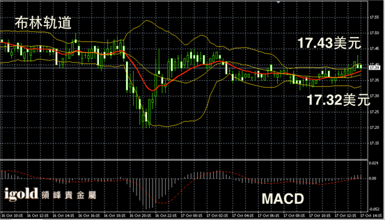 白银阴阳烛录得布林轨道收窄,且柱体较短,整体处于红色日均线中位,短线MACD显示呈中性,白银价格下午或小幅回落至17.35美元附近整理。