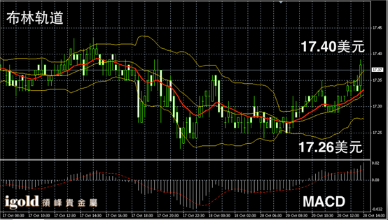 白银阴阳烛录得柱体高于红色日均线,且布林轨道小幅上扬,短线MACD显示弱势多头主导,白银价格下午或小幅上探17.4美元,随后或偏于在17.36美元附近整理。
