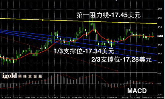 白银阴阳烛录得柱体收短,且末端连续阴烛后录得十字星,短线MACD显示呈中性,白银价格或回落至17.35-17.4美元区间震荡。