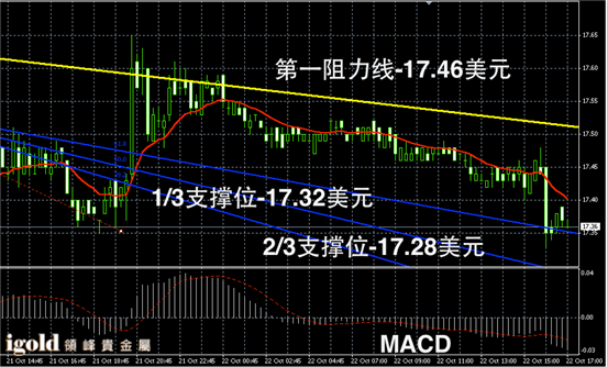 白银阴阳烛录得长阴烛出现,末端柱体低于红色日均线,短线MACD显示空头主导,白银价格小幅持稳17.4美元后,或继续下探17.35美元附近。
