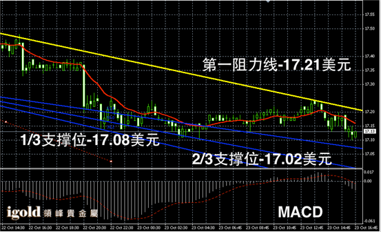 白银阴阳烛录得柱体仍然较短,后期小幅低于红色日均线,短线MACD显示弱势空头主导,白银价格晚上或浮动在17.15美元附近。建议低位支撑参考17.1美元附近。