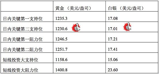 昨日概括:因为昨晚美国数据录得向好,美国股市收盘走高,美元指数小幅收高,贵金属市场昨晚承压下行,跌破区间支撑后继续回落。国际黄金价格昨晚从1239美元附近下行至1234美元附近,最低时一度触及至1227美元/盎司;国际白银价格则继续浮动在17.2美元附近。美元指数录得从85.7攀升至85.8,欧元报价录得1.26美元。