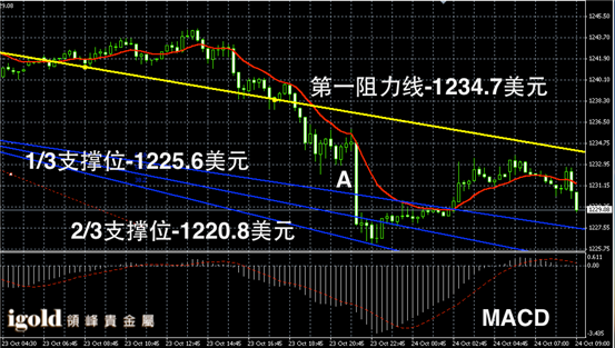 技术回顾:昨晚的评论中,我们反复提醒投资者留意美国数据和黄金价格在1239美元附近的重要多空分界线,明确指出,金价一旦跌破这一支撑会有新的下行趋势出现,这些判断都与昨晚的趋势完全一致。