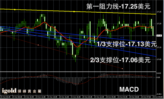 白银阴阳烛录得回落后,小幅攀升,后期柱体处于红色日均线中位,短线MACD显示呈中性,白银价格或横盘运行,整体围绕17.2美元附近,并偏于回升至17.23美元附近。