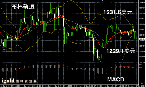 黄金阴阳烛录得离散率增加,阴阳烛高低交叉于红色日均线,布林轨道小幅收窄,且有所下行,黄金价格下午或小幅回调,建议密切关注1229美元,若跌破或回落至1227美元附近。持稳或继续围绕1230美元横盘运行。