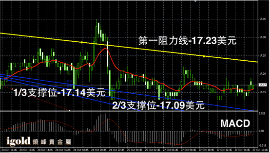 白银阴阳烛录得多次下探后,阳烛增多,且后期高于红色日均线,短线MACD显示弱势空头主导,白银价格晚上或逐渐回升至17.2美元附近。