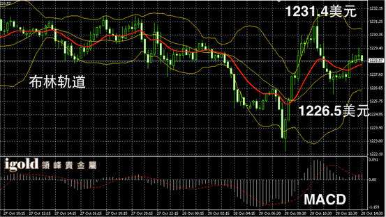 黄金阴阳烛录得布林轨道区间扩大,小幅反弹后柱体收短,末端布林轨道中线与日均线重合,短线MACD显示弱势多头主导,下午黄金价格持稳1228美元后,或再次上探1230美元。