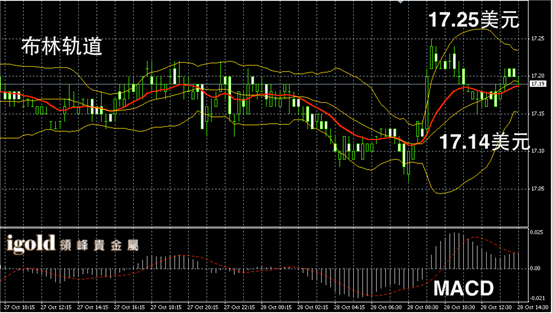 白银阴阳烛录得布林轨道小幅上扬,反弹调整后持稳17.2美元附近,短线MACD显示弱势多头主导,白银价格或小幅突破17.23美元附近。
