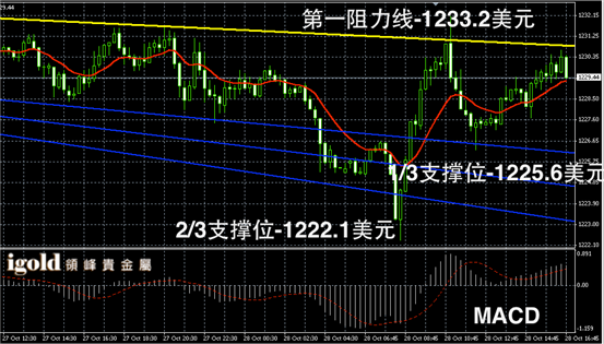 黄金阴阳烛录得高于红色日均线,短线MACD显示弱势多头主导,不过末端仍然未突破1230美元,晚上或在1226美元附近回落,若美指反弹,低位探破1225美元后,或继续看跌至1222美元附近。