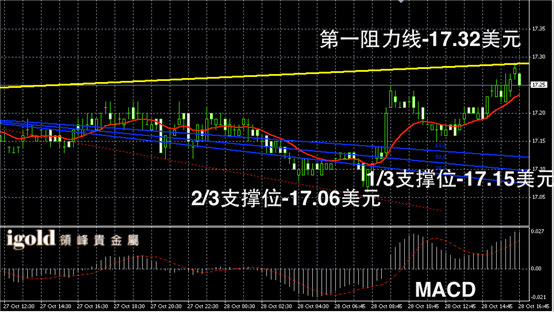 白银阴阳烛录得小幅反弹,短线MACD显示弱势多头主导,高位未能突破17.3美元,美盘时段白银价格或回落至17.2美元附近。