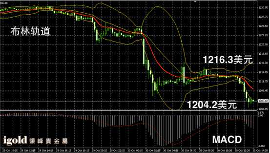 黄金阴阳烛录得布林轨道下行趋势明显,末端阴烛增多,且低于红色日均线,短线MACD显示弱势空头主导,美元指数若未能突破86.3,金价下午或在1206美元附近持稳。空头支撑可参考1205美元,一旦跌破或进一步滑落。