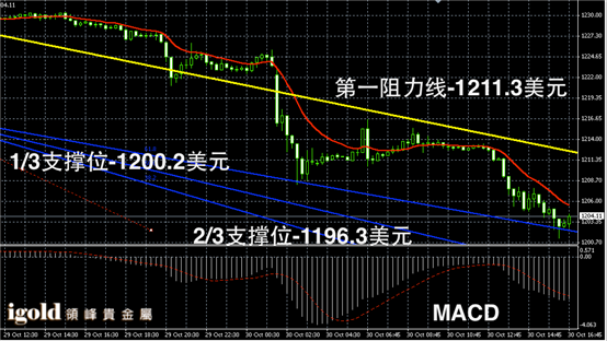 此外,晚上美国三季度GDP初值公布,市场预期增幅或在3-4%之间,若美国三季度GDP数据大幅高于预期的话,贵金属市场很有可能遭遇二连击。黄金价格跌破1200美元强力支撑的几率大幅攀升。