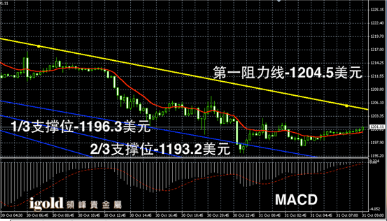 黄金阴阳烛录得下行后,末端柱体收短,且小幅回升至日均线中位,短线MACD显示空头消散,黄金价格上午或不断持稳1200美元附近,或小幅上探至1205美元附近。