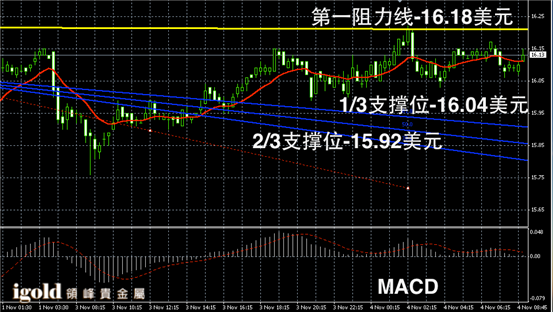 白银阴阳烛录得小幅反弹,后期阳烛增多,短线MACD显示呈中性,白银价格短线持稳16.1美元后,或尝试不断持稳16.15美元附近。