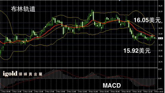 白银阴阳烛录得柱体低于红色日均线,布林轨道下行反弹,显示回落触底,白银价格下午或小幅回升至16美元附近。随后可能回调至16.05美元处。
