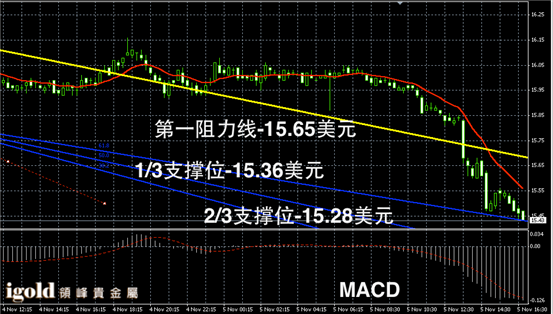 白银阴阳烛录得下行趋势明显,连续阴烛大幅低于红色日均线,短线MACD显示空头主导,白银价格或不断下探15.4美元后,进而回落至15.35美元附近。