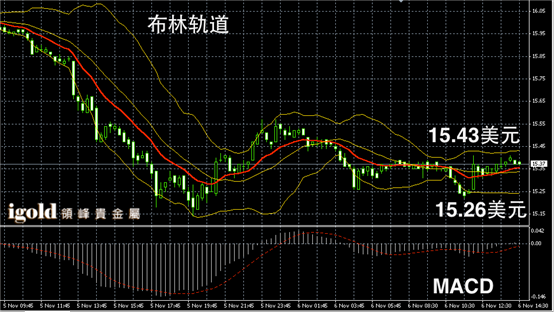 白银阴阳烛录得柱体整体处于红色日均线中位,布林轨道整体收平,短线MACD显示呈中性,白银价格或在15.4美元附近不断持稳。美指若回落,白银价格或尝试反弹至15.46美元附近。