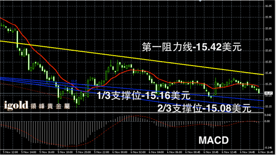 白银阴阳烛录得柱体较短,整体高低交叉于红色日均线,短线MACD显示呈中性,白银价格或小幅下探15.3美元附近,美指若回升,白银价格或再次下探15.2美元。