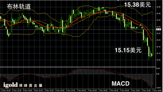 白银阴阳烛录得急跌急升走势明显,底部V型反弹,显示15.1美元附近为低位支撑,布林轨道录得中位反弹,白银价格下午或在15.25美元附近盘整。并可能尝试不断持稳15.3美元附近。