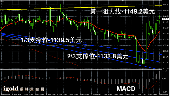 黄金阴阳烛下行后,录得连续阳烛,且高于红色日均线,短线MACD显示多头主导,黄金价格或在1145美元附近不断持稳,美指若继续回落,市场或小幅上探1147美元附近。