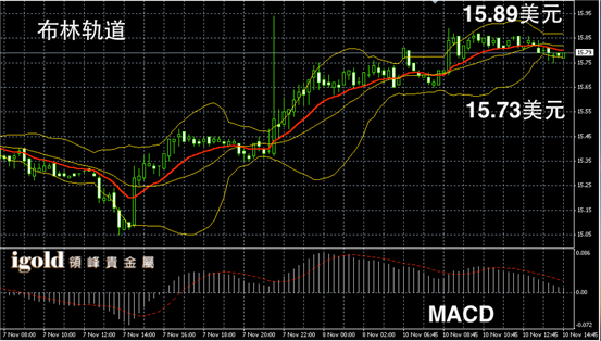 白银阴阳烛录得小幅攀升后,柱体回落,布林轨道区间收平,短线MACD显示弱势空头主导,白银价格下午短线或不断在15.8美元附近持稳,并可能再次小幅反弹15.86美元附近。
