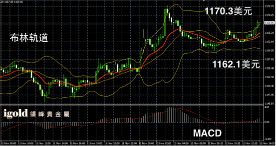黄金阴阳烛录得后期阳烛增多,且逐渐高于红色日均线,布林轨道区间上升,短线MACD显示呈中性,金价下午若能突破1168美元,或继续攀升至1170美元附近,若不能突破或回落至1165美元处整理。