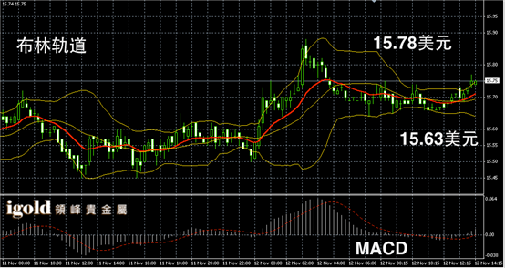 白银阴阳烛录得小幅攀升,后期柱体高于红色日均线,布林轨道区间较窄,整体收平,短线MACD显示呈中性,白银价格下午或在15.75美元附近整理,持稳或向15.8美元附近突破。