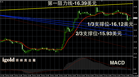 白银阴阳烛录得长阴烛回落后,末端持稳,柱体仍然低于红色日均线,短线MACD显示呈中性,白银价格则晚上或在16.2美元附近盘整,回升至16.3美元以上的几率降低,此前白银价格有超买行情。