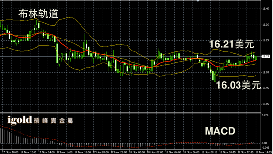 白银阴阳烛录得布林轨道横盘运行,且柱体较短,短线MACD显示呈中性,白银价格下午或继续围绕16.15美元附近整理。