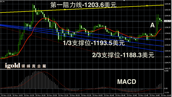 黄金阴阳烛录得末端阳烛跳升后柱体收短,且伴随阴烛回落,短线MACD显示弱势多头主导,金价在1198美元附近阻力较大,未突破前或在阳烛A的高低价区间进行盘整,如突破或进而上升至1204美元附近。