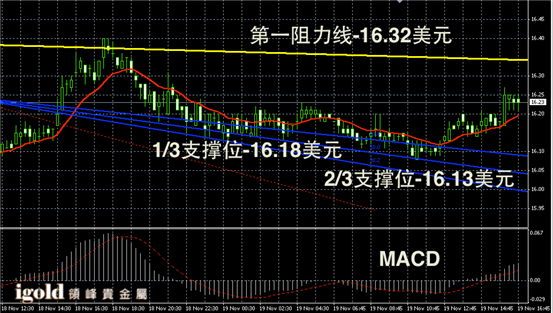白银阴阳烛录得小幅反弹后,阴烛再次回落,短线MACD显示弱势多头主导,白银价格短线或首先持稳16.2美元,进而多次上探16.3美元附近。