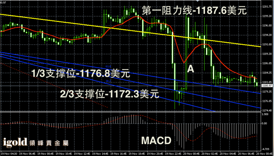 黄金阴阳烛录得波幅扩大,后期阴烛增多,且低于红色日均线,短线MACD显示空头主导,黄金价格短线或不断测试1176美元附近,若跌破或进一步下行;持稳或回升至1181美元附近。