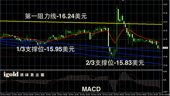 白银阴阳烛录得末端阴烛增多,后期仍低于红色日均线,短线MACD显示空头主导,白银阴阳烛建议密切留意16美元,若跌破或进一步下探15.93美元附近。