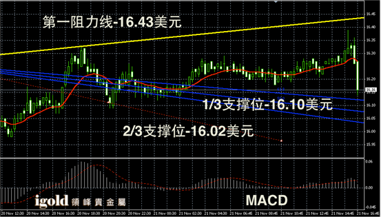 白银阴阳烛录得小幅反弹后,阴烛大幅回落,短线MACD显示呈中性,白银价格因为美指反弹至87.8,暂时承压,晚上美指若突破87.9,上触88,白银价格或不断下行测试16.1附近,持稳则偏于回升至16.23美元附近盘整。