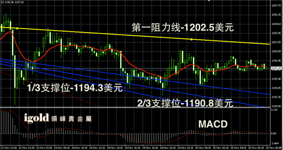 技术回顾:昨晚的评论中,我们指出市场整体偏空,且给出了黄金价格在1194-1200运行的区间预测,这些都与昨晚的走势相符。