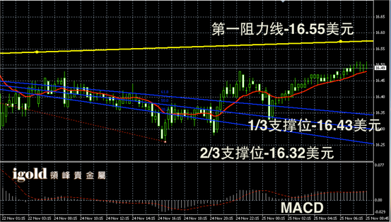 白银阴阳烛录得柱体小幅高于红色日均线,多头缓慢增加,短线MACD显示弱势多头主导,白银价格在16.55美元附近阻力较大,短线或围绕16.5美元进行整理。