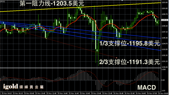 黄金阴阳烛录得冲高后,后期回落,末端低于红色日均线,短线MACD显示呈中性,黄金价格短线或首先在1199美元附近整理,一旦突破1200美元附近,或再次向1202美元附近攀升。