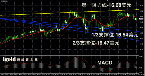 白银阴阳烛录得离散率增加,后期阴阳烛高低交叉于红色日均线,短线MACD显示呈中性,白银价格或小幅下探16.6美元,若跌破或回落至16.55美元附近,持稳或反弹至16.67美元附近。