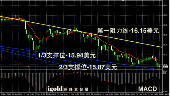 白银阴阳烛录得后期阴烛继续增加,且低于红色日均线,短线MACD显示弱势空头主导,白银价格或不断下探16美元,一旦跌破或进而向15.95美元附近靠拢。