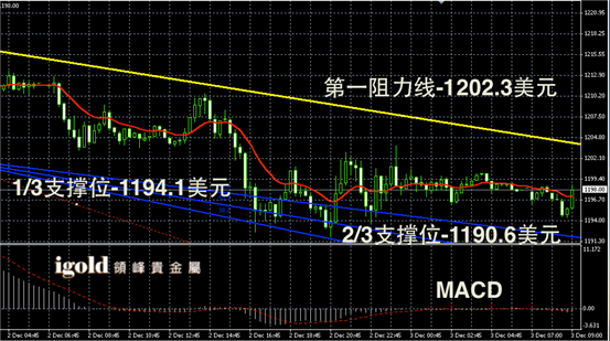 技术回顾:昨晚的评论中,我们明确指出金价会小幅下探1198美元,并且预测跌破后会滑落至1193美元附近,这一预测与昨晚的趋势完全相符。