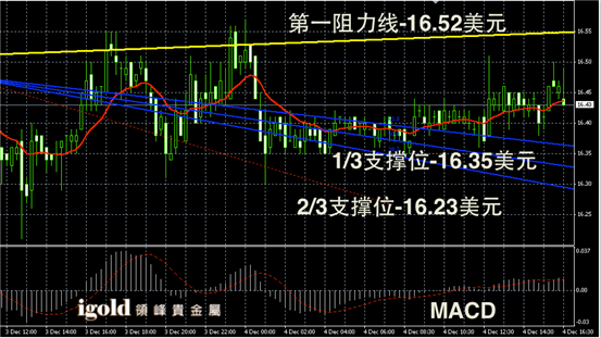 白银阴阳烛录得柱体收短,后期阴烛增多,短线MACD显示弱势多头主导,白银价格或整体浮动在16.4美元附近。跌破或向16.35美元滑落。
