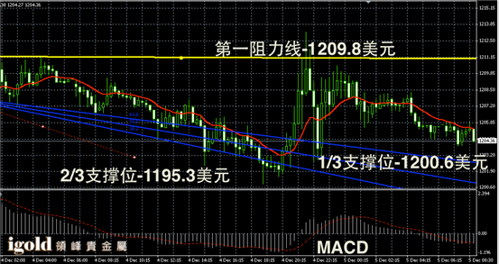 技术回顾:昨晚的评论中,我们明确指出金价在1210美元的阻力较大,反弹不能突破后会回落,并且给出了1200-1210的运行区间,这些预测与昨晚的趋势完全相符。