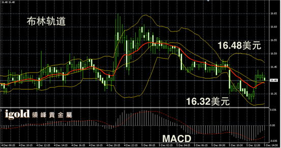 白银阴阳烛录得回落后,柱体处于红色日均线中位,末端布林轨道收平,短线MACD显示弱势空头主导,白银价格下午或继续在16.4美元附近弱势盘整。并可能再次下探16.35美元附近。