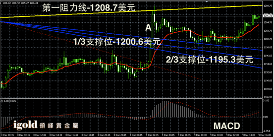 黄金阴阳烛末端录得阳烛,且高于红色日均线,短线MACD显示弱势多头主导,黄金价格短线或小幅上探1208美元,未突破前或仍旧在阳烛A的区间运行,即1198-1206美元区间。