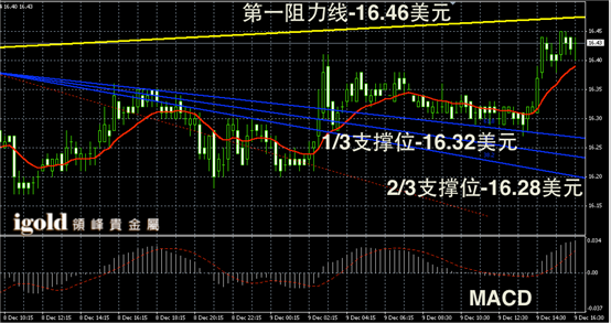 白银阴阳烛录得反弹后,末端阴烛增加,后期逐渐回落至红色日均线中位,短线MACD显示弱势多头主导。白银价格或不断在16.4美元附近持稳,短线16.45美元阻力较大,未突破前或再次回落。