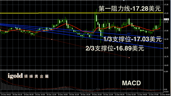 白银阴阳烛录得柱体较短,后期阳烛增多,且高于红色日均线,短线MACD显示呈中性,白银价格上午或不断上探17.2美元,若不能突破或回落至17.1美元附近整理。