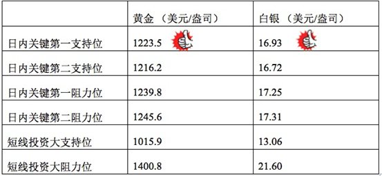 黄金日线录得连续阳烛后阴烛回落,不过仍高于红色日均线,且MACD显示弱势多头主导,不过小时线上,黄金RSI录得44,已经回调。预期黄金价格短线或不断持稳1224美元,一旦跌破或向1218美元附近下行。白银日线末端录得十字星,显示17.1美元附近阻力加大,小时线上RSI录得52,回调至区间中位,后期白银价格或不断测试17美元。