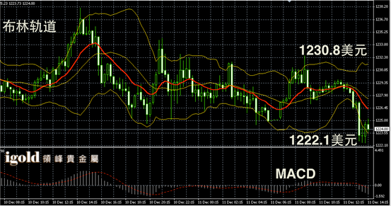 黄金阴阳烛录得末端阴烛增多,且低于红色日均线,短线MACD显示弱势空头主导,布林轨道录得区间下探,午后金价或进一步下探1220美元,若跌破或进一步向1216和1213美元附近滑落。